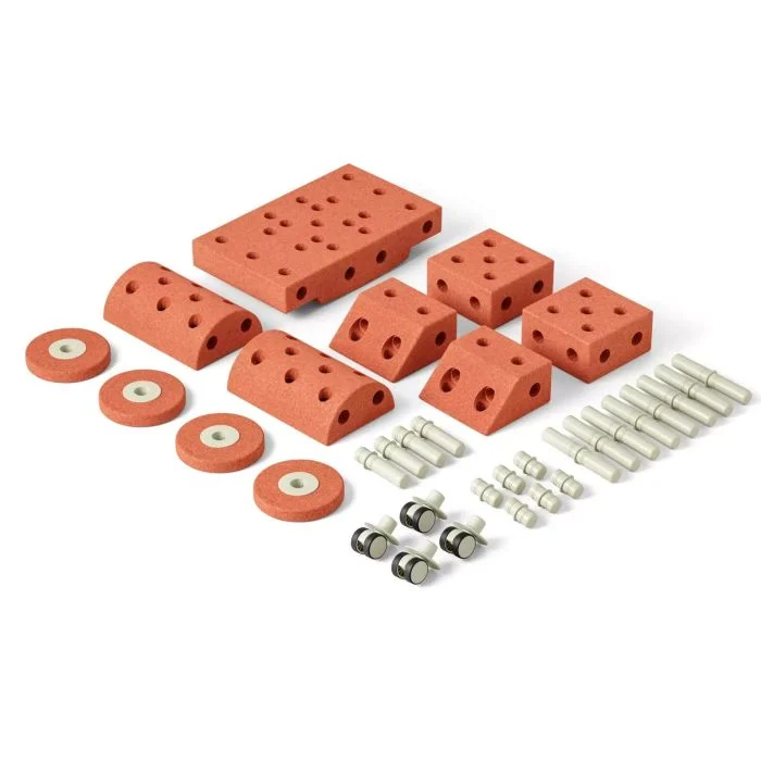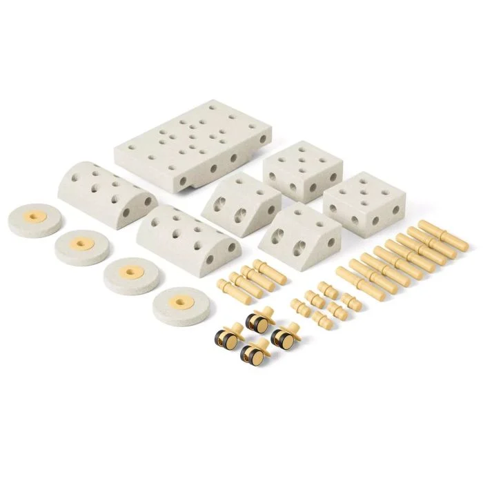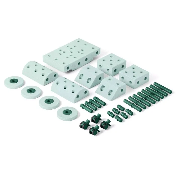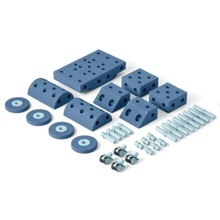 - Duży MODU Dreamer set – 7 bloków, 4 koła piankowe, 4 kółka, 8 bolców